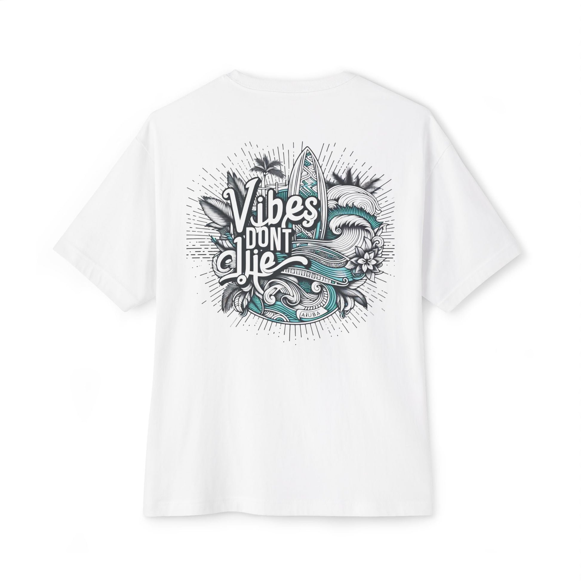 Aruba focused tee with a Vibes Don’t Lie surfboard, wave, and palm leaves design. Perfect for those seeking relaxed beach vibes. Ideal for beachgoers, surfers, and vacationers. Relevant for summer, beach vacations, and tropical getaways.